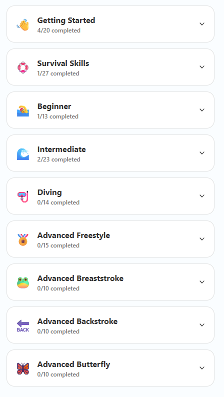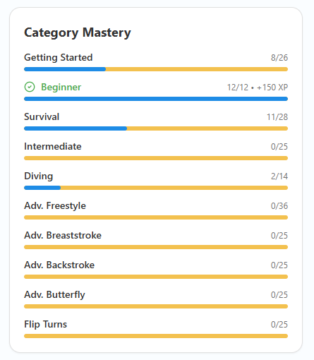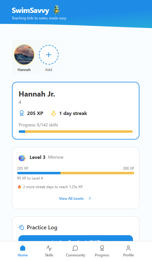 Gamified swim learning app for parents teaching young children foundational swim skills through fun, bite-sized drills and interactive challenges.