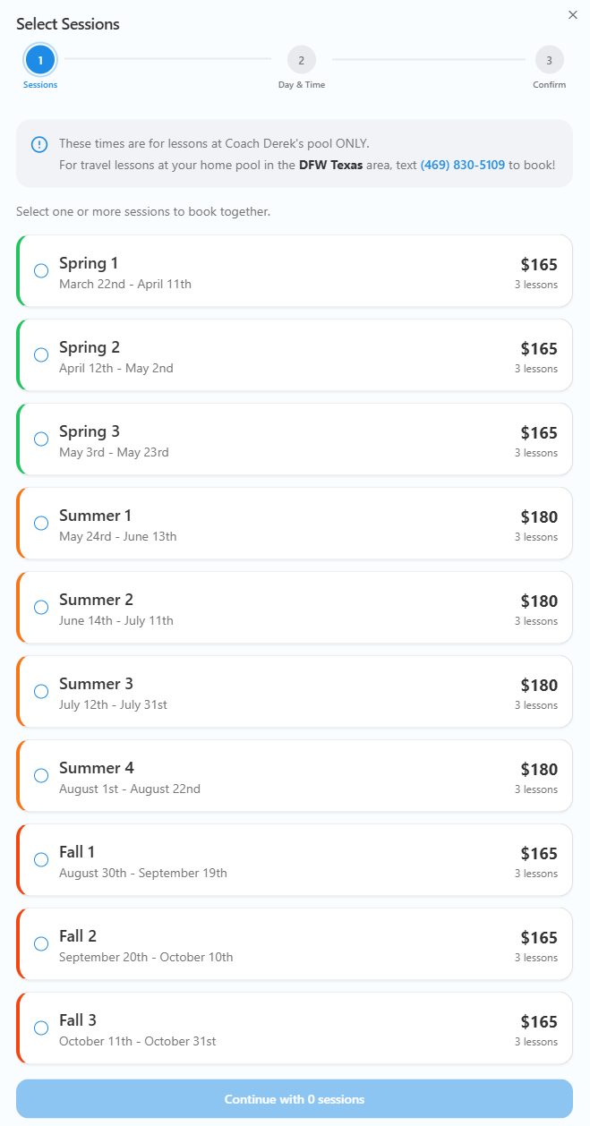 Book and manage your lessons with Coach Derek — see open spots, get weather updates, and reschedule anytime