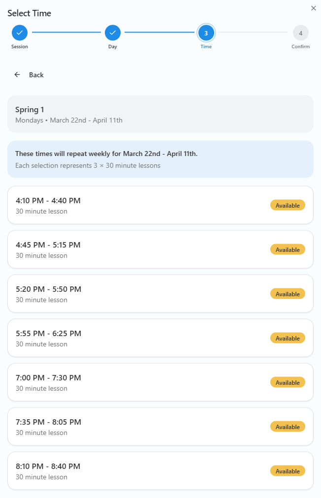 Full booking system for lessons with Coach Derek